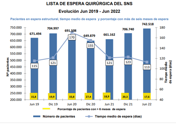 Recientemente, el Ministerio de Sanidad, Servicios Sociales e Igualdad ha publicado el último informe de listas de espera que hace referencia al primer semestre de 2022 y en el que se refleja que un total de 742.518 pacientes estaban en lista de espera para operarse en el Sistema Nacional de Salud (SNS). La cifra representa un aumento del 12,31% respecto al mismo periodo del año anterior.